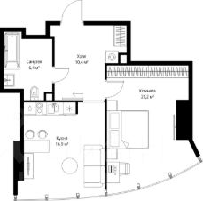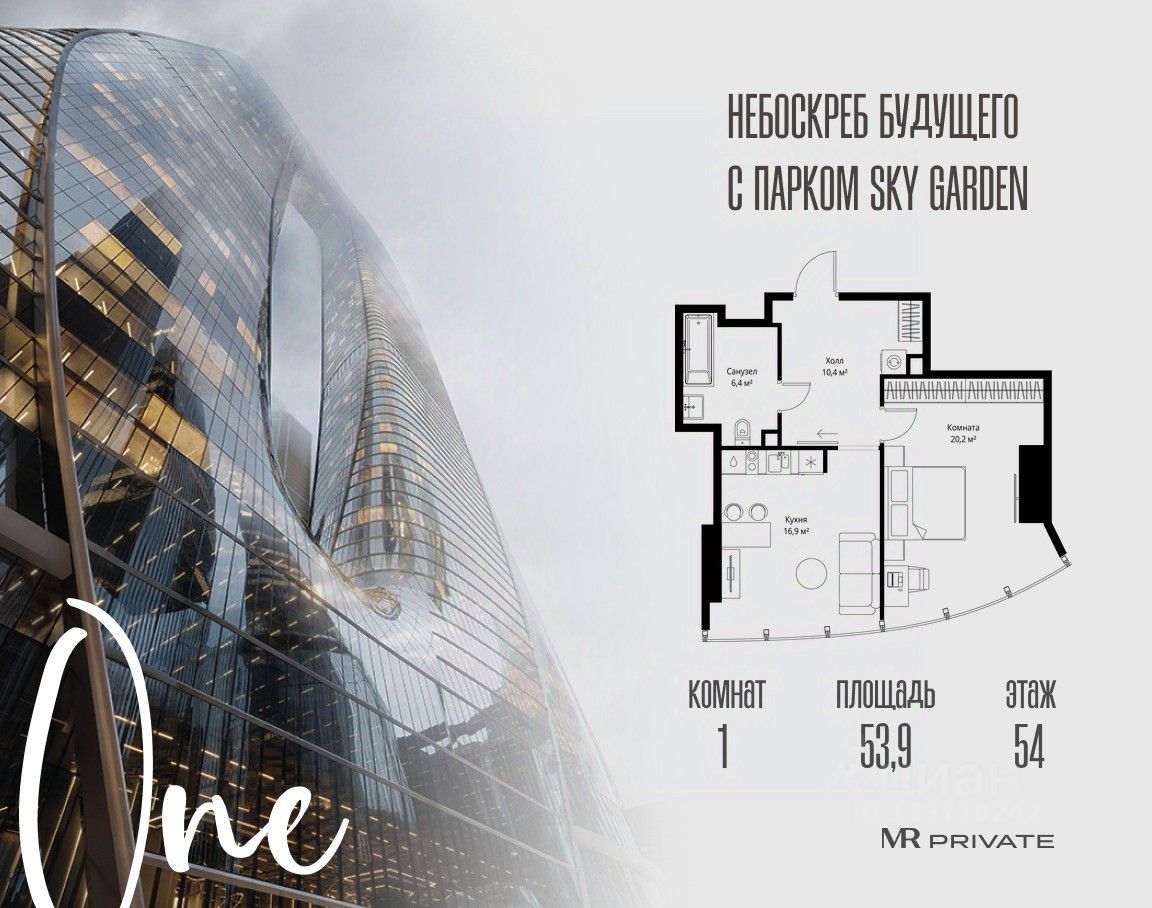 В продаже 1-комнатная квартира площадью 53.90 м² на 54-м этаже.