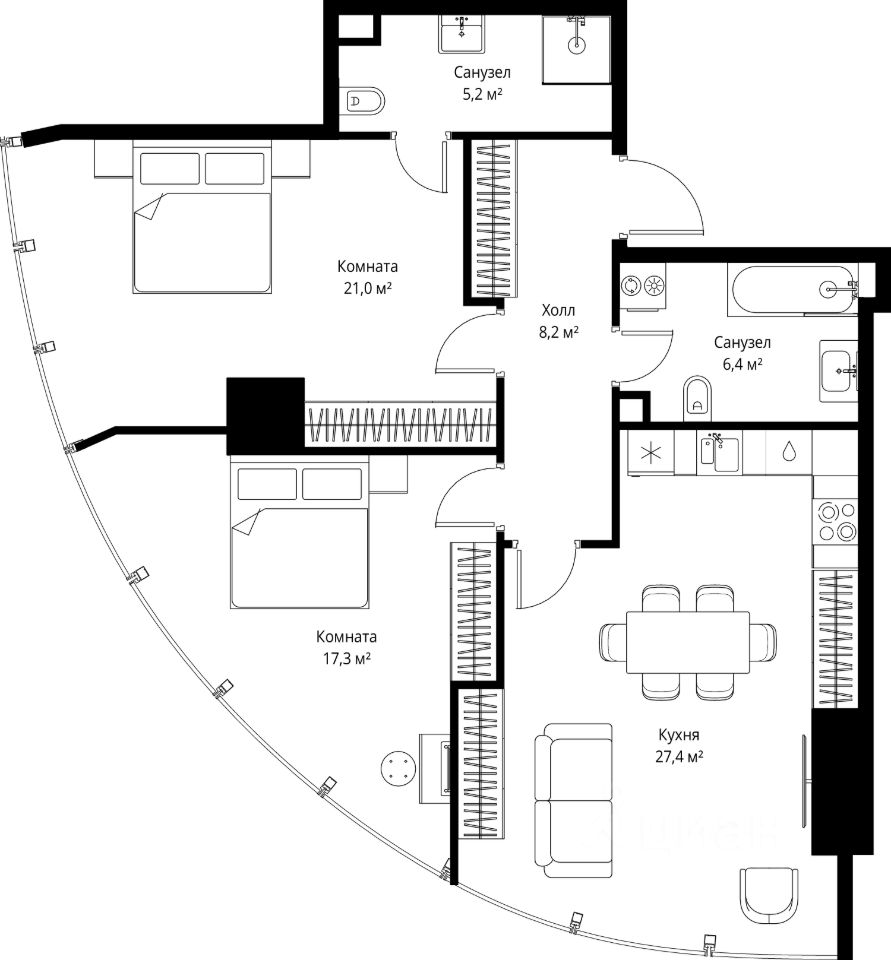 В продаже 2-комнатная квартира площадью 85.50 м² на 52-м этаже.