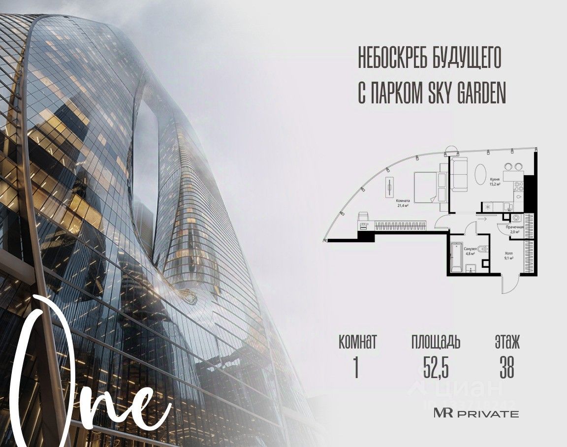 В продаже 1-комнатная квартира площадью 52.50 м² на 38-м этаже.