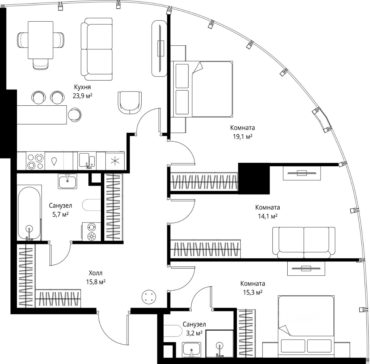 - Панорамное остекление от пола до потолка во всех квартирах