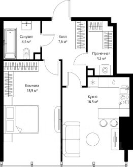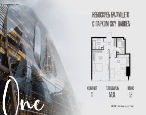 В продаже 1-комнатная квартира площадью 51.80 м² на 53-м этаже.
