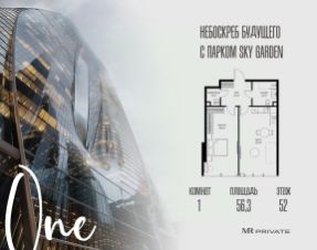 В продаже 1-комнатная квартира площадью 56.30 м² на 52-м этаже.