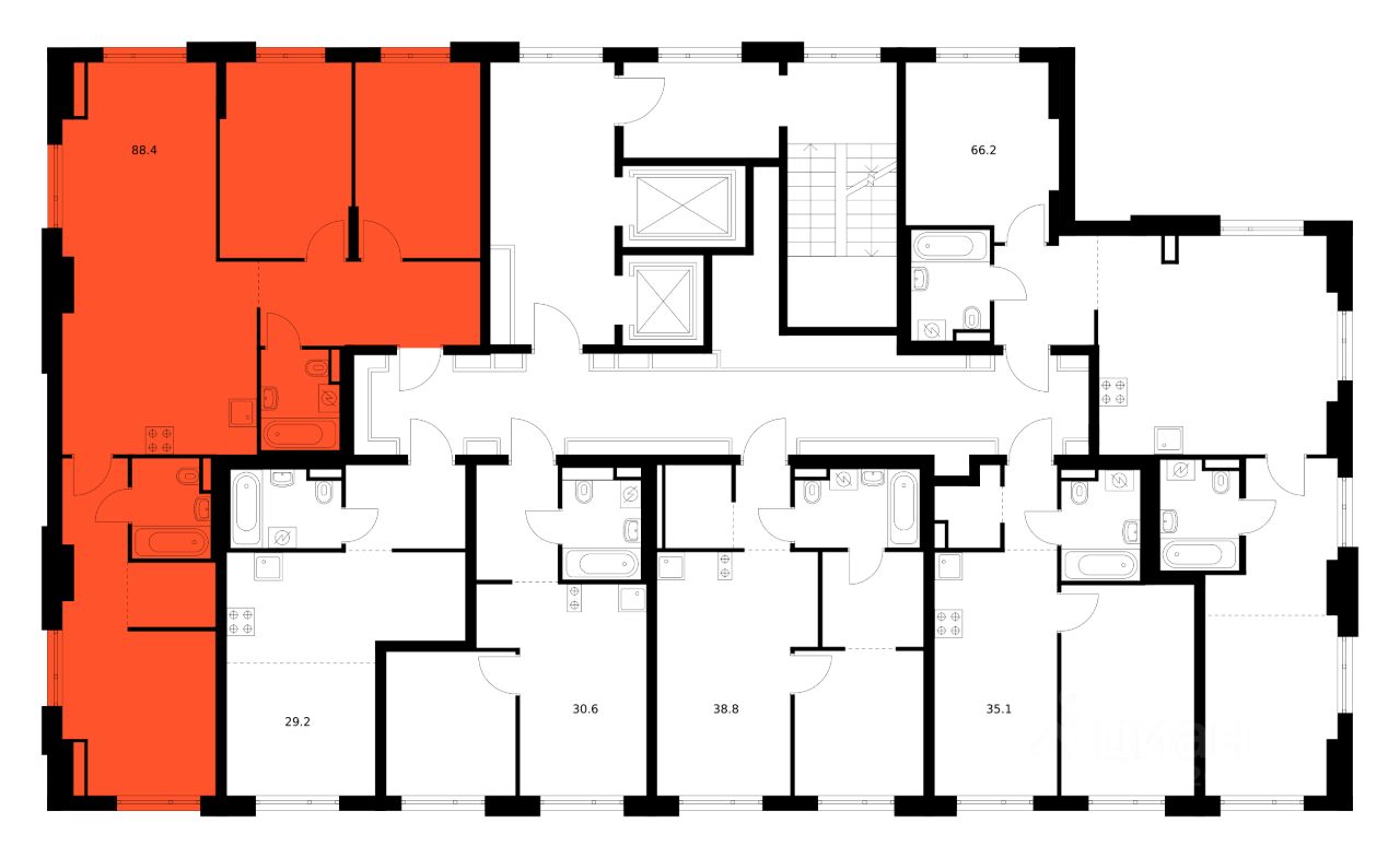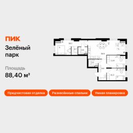Продаётся 3-комн. квартира площадью 88,4 кв.м на 14 этаже 14 этажного дома (Корпус 5.1, Секция 2) проекта ПИК Зелёный парк. Светлый просторный подъезд на уровне земли, функциональная планировка, большие окна, предчистовая отделка.