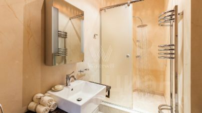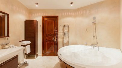 Выполнена авторская отделка в классическом стиле с использованием премиальных материалов и мебели: