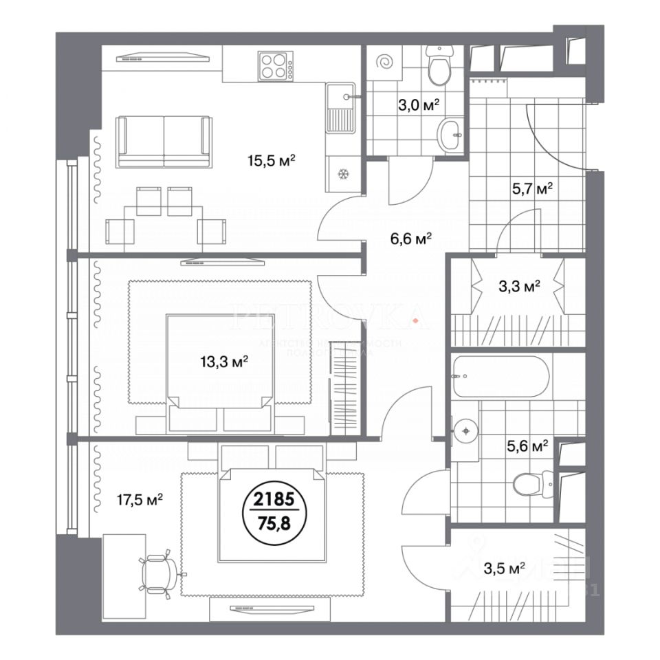 Вариант планировочного решения: Кухня-гостиная 15,5 м² — уютная зона для встреч с близкими. Две спальни — 13,3 и 17,5 м² — комфортные помещения для отдыха. Коридор 5,7 м² и прихожая 3,5 м² обеспечивают комфортную организацию пространства. Высота потолков 3,05 м создаёт ощущение воздуха и простора.