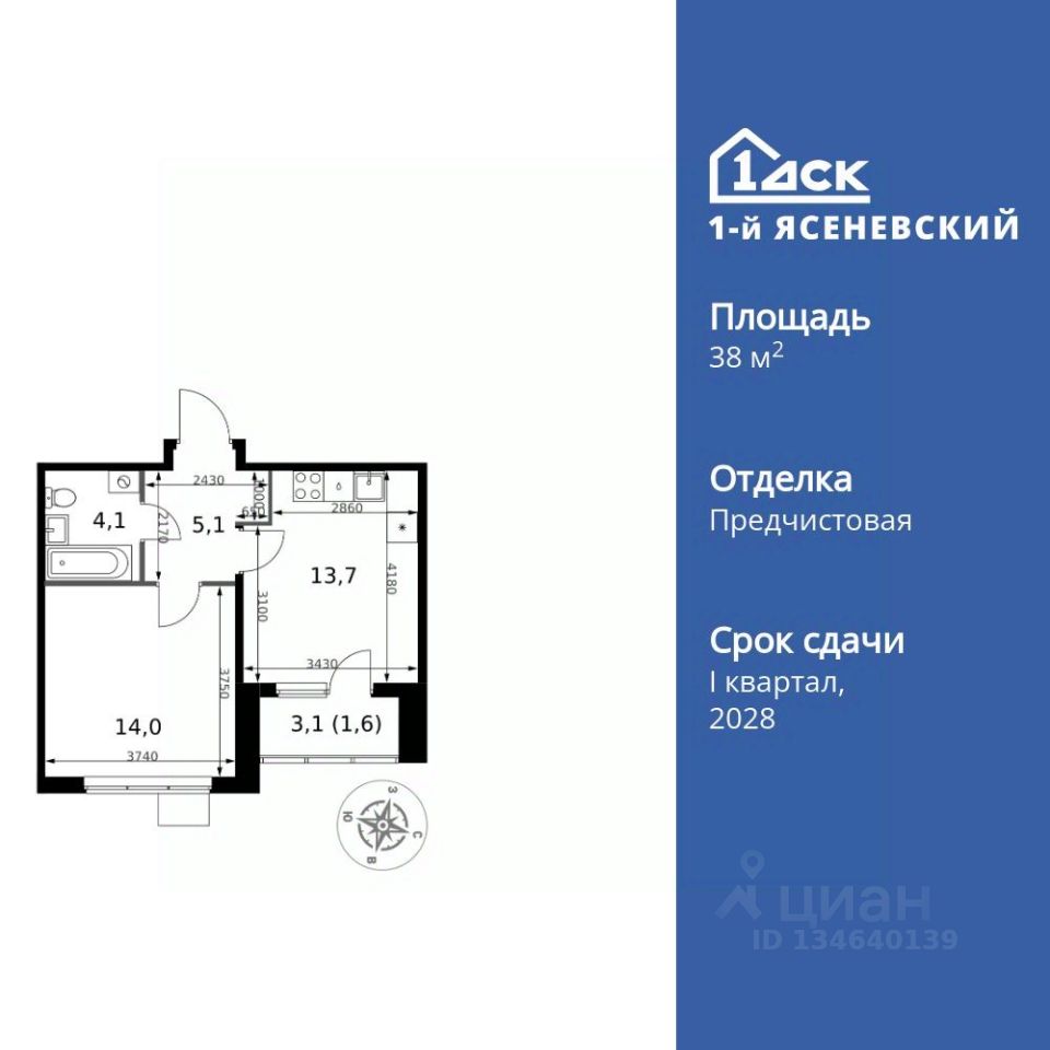 Продаётся 1-к квартира номер 261 общей площадью 38.5 кв.м. на 5-м этаже 18 этажного здания. Предчистовая отделка. Цена с учётом скидки.
