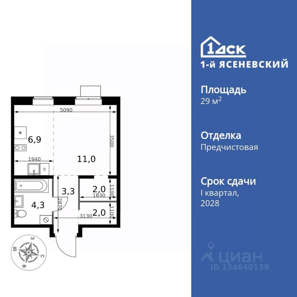 Продаётся квартира-студия номер 779 общей площадью 29.5 кв.м. на 10-м этаже 18 этажного здания. Предчистовая отделка. Цена с учётом скидки.