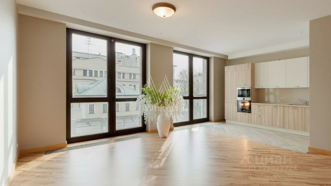 Панорамные окна в пол наполняют комнаты светом, при этом в квартире тихо и приватно. Окна смотрят в сторону Хилкова переулка и во двор. Высота потолков — 3,2 метра.