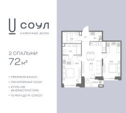Продается 2-к. квартира номер 86 общей площадью 72 кв.м. на 2-м этаже 8 этажного дома, камерные дома СОУЛ (премиум-класс). Без отделки.