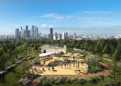 ЖК "Амбер Сити": многоуровневый ландшафт на 6 гектарах с зелёным бульваром, объединяющим арт-объекты, водные зоны и архитектурные формы. В закрытых дворах на стилобате - детские площадки с сенсорными элементами, зоны отдыха с креслами и настилами для йоги. Навесы с подогревом и зарядками для зимнего сезона.