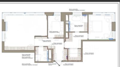 Планировочное решение: 116,8 кв.м., три комнаты: кухня-гостиная, мастер спальня, вторая спальня, гардеробная комната, два санузла (один с ванной, второй с душевой кабиной).