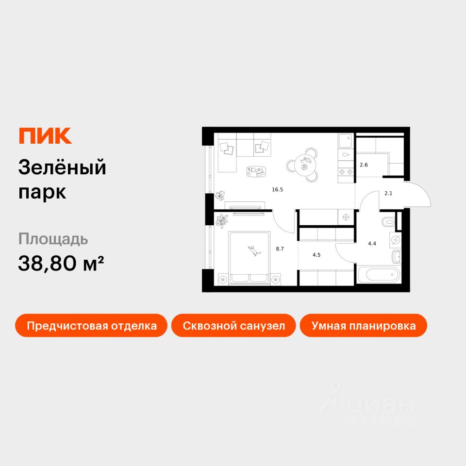 Продаётся 1-комн. квартира площадью 38,8 кв.м на 14 этаже 14 этажного дома (Корпус 5.1, Секция 2) проекта ПИК Зелёный парк. Светлый просторный подъезд на уровне земли, функциональная планировка, большие окна, предчистовая отделка.