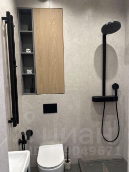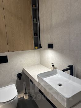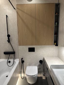 • установлена встроенная мебель: кухня с премиальной техникой и столешницей из искусственного камня, шкафы в прихожей, шкаф в постирочной зоне с стиральной машиной LG, шкафы и тумбы в сан. узлах,