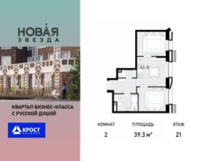Продаётся 2-к квартира 39.3 кв.м. на 21-м этаже 21 этажного дома, корпус 1 - Резиденция "Вологда". Без отделки.