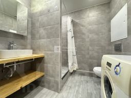 Совмещённый санузел с качественной отделкой и современной сантехникой, установлена стиральная машина.