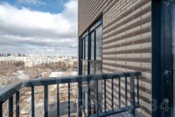 Фасад Дома выполнен из навесных трехслойных стеновых панелей, облицованных кирпичом в песочных оттенках. Для удобства жителей установлены металлические корзины под кондиционеры в одном тоне с наружными стенами. На лоджиях использовано стоечно-ригельное остекление в профилях из алюминиевых сплавов.