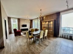 В квартире выполнен качественный ремонт и красивая дизайнерская отделка в стиле легкой классики. В отделке применялись натуральные материалы - на полу дубовый паркет, портьеры из натуральных тканей на хлопковой подкладке, натуральные обои. Квартира оснащена всей необходимой для комфортного проживания мебелью и техникой - кухня известной немецкой марки, мебель фламандского стиля привезена на заказ из Франции, светильники итальянского бренда Baga, техника на кухне от известных фирм Miele, Bosch, Siemens, сантехника немецкой премиальной марки Villeroy & Boch.