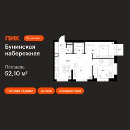 Продаётся 2-комн. квартира площадью 52,1 кв.м на 9 этаже 16 этажного дома (Корпус 2.6/1.5, Секция 5) проекта ПИК Бунинская набережная. Светлый просторный подъезд на уровне земли, функциональная планировка, большие окна, c отделкой.