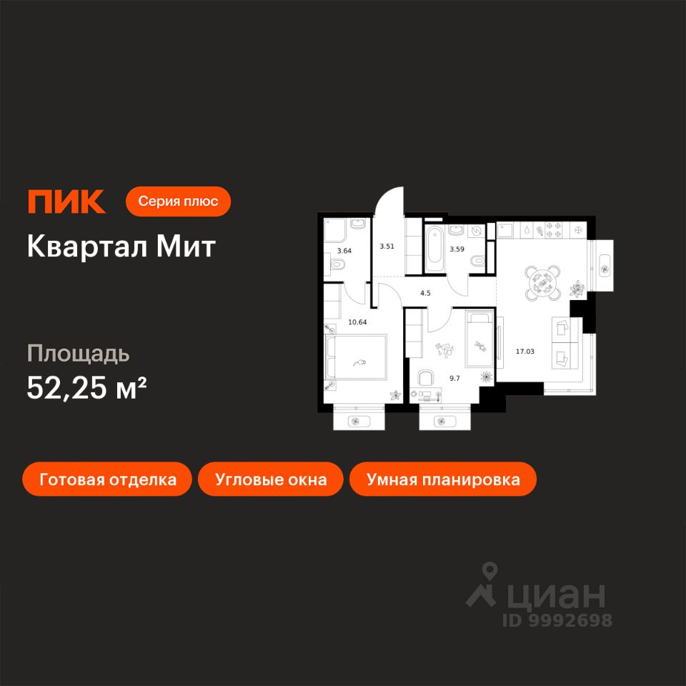 Продаётся 2-комн. квартира площадью 52,25 кв.м на 26 этаже 26 этажного дома (Корпус 3.2, Секция 2) проекта ПИК Квартал Мит. Светлый просторный подъезд на уровне земли, функциональная планировка, большие окна, c отделкой.
