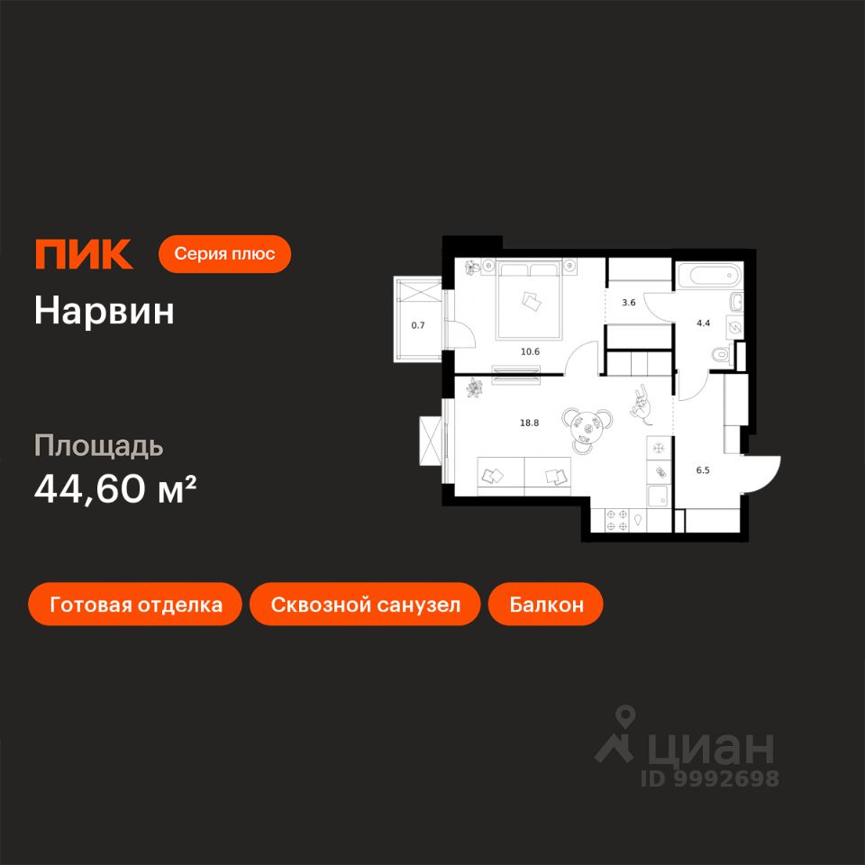 Продаётся 1-комн. квартира площадью 44,6 кв.м на 29 этаже 38 этажного дома (Корпус 1.1, Секция 1) проекта ПИК Нарвин. Светлый просторный подъезд на уровне земли, функциональная планировка, большие окна, c отделкой.