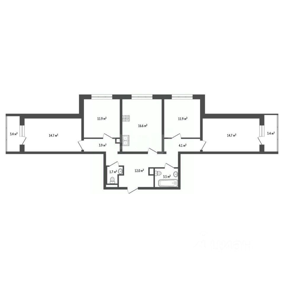 - Комнаты изолированные 14,7 м²; 14,7 м²; 11,9 м²; 11,9 м²