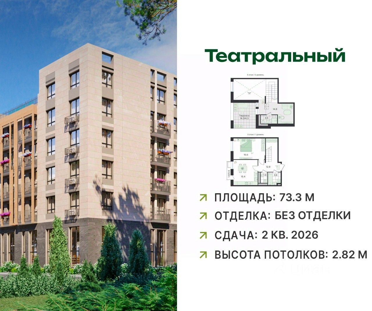 В современном квартале бизнес-класса ЖК "Театральный" продаётся 2-комнатная квартира, общей площадью 73.3 кв.м, расположенная на 5 этаже (корпус 2, секция 1).