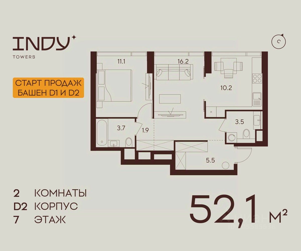 Продается 2-комнатная квартира на 7 этаже жилого комплекса Indy Towers. Срок сдачи: 3 кв. 2029 г.