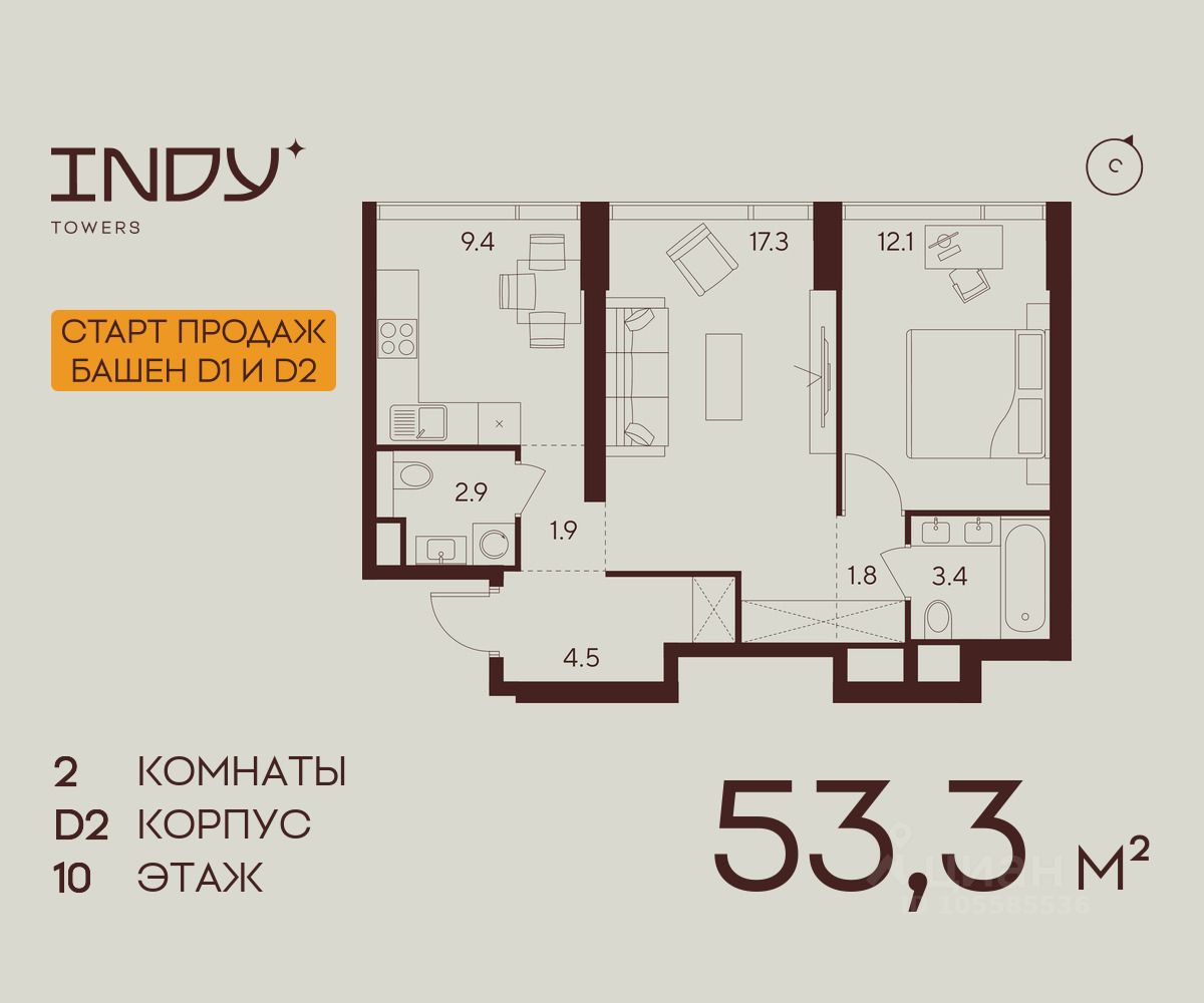 Продается 2-комнатная квартира на 10 этаже жилого комплекса Indy Towers. Срок сдачи: 3 кв. 2029 г.