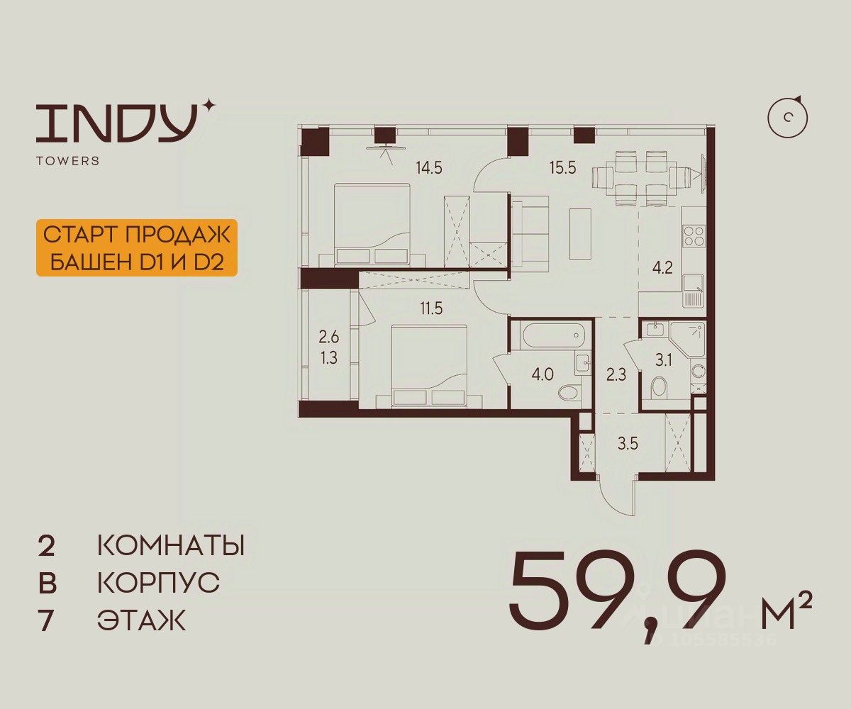 Продается 2-комнатная квартира на 7 этаже жилого комплекса Indy Towers. Вид из окон: на улицу. Срок сдачи: 4 кв. 2026 г.