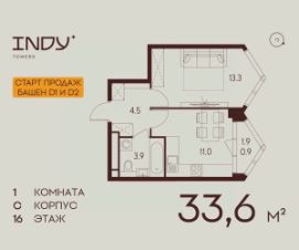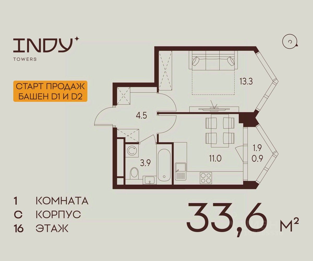 Продается уютная однокомнатная квартира на 16 этаже жилого комплекса Indy Towers. Вид из окон: на улицу. Срок сдачи: 4 кв. 2026 г.