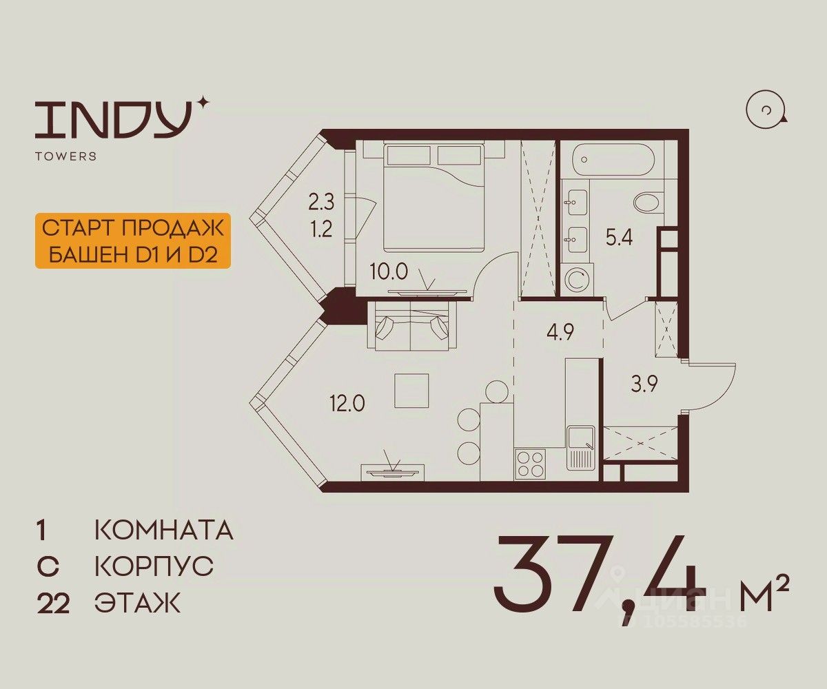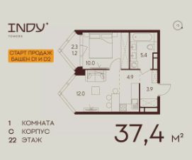 Продается уютная однокомнатная квартира на 22 этаже жилого комплекса Indy Towers. Вид из окон: во двор. Срок сдачи: 4 кв. 2026 г.