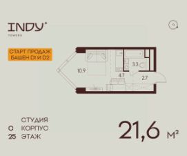 Продается просторная студия на 25 этаже жилого комплекса Indy Towers. Вид из окон: во двор. Срок сдачи: 4 кв. 2026 г.