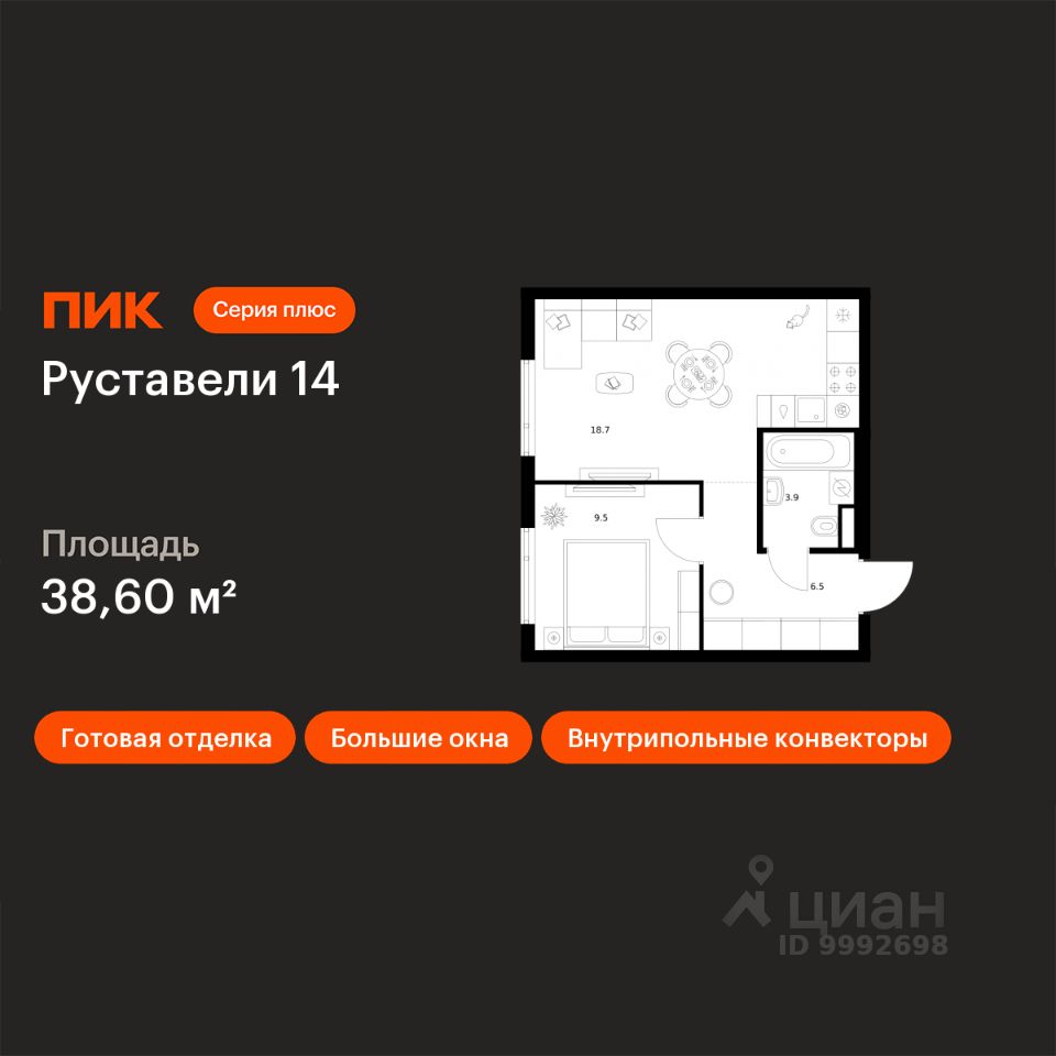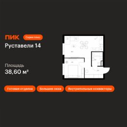 Продаётся 1-комн. квартира площадью 38,6 кв.м на 16 этаже 16 этажного дома (Корпус 3.6, Секция 2) проекта ПИК Руставели 14. Светлый просторный подъезд на уровне земли, функциональная планировка, большие окна, c отделкой.
