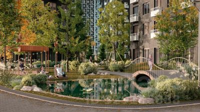 Чтобы отдохнуть от суеты города, достаточно выйти во двор: здесь раскинулся настоящий лес с живописными пейзажами. В тени деревьев жителей ждут пруд с мостиком и беседкой на берегу, тихие прогулочные аллеи, спортивная площадка и зоны для занятий йогой и бадминтоном на свежем воздухе.