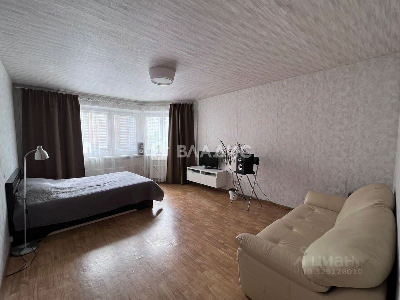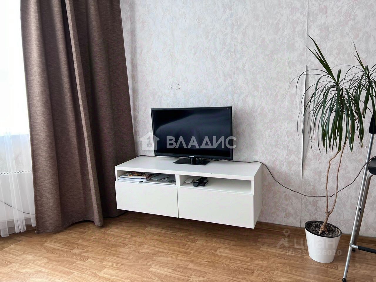 Квартира расположена на 6-м этаже 19-этажного монолитной постройки 2012 года. Общая площадь составляет 44 кв. м, жилая — 29 кв. м. Высота потолков 2,6 м создаёт ощущение простора. Из окон открывается вид на улицу.