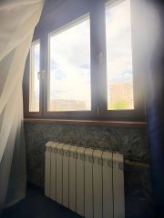 балкон: полностью остеклен, сделана отделка, есть светильник. Шум с улицы не слышен, так как дом расположен перпендикулярно дороге