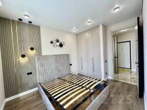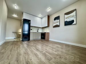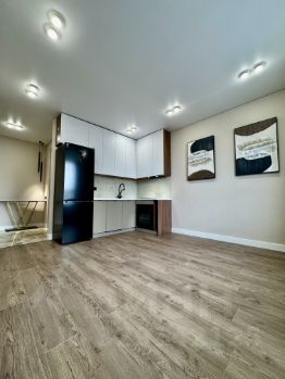 По факту это евро-двухкомнатная квартира с функциональной планировкой: большая кухня-гостиная, оборудованная кухонным гарнитуром и бытовой техникой; отдельная спальня с кроватью и встроенным шкафом; просторный холл, вместительная гардеробная; совмещенный санузел, оснащенный импортной сантехникой.