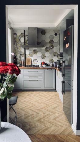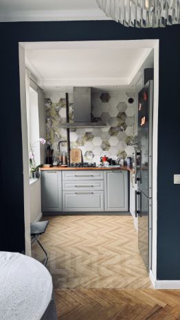 Пол - паркет, с/у - современная плитка, полностью заменена электрика, трубы; окна - м/пл, балкон остеклен; разноплановое освещение, обои - под покраску, при желании можно сменить цветовую гамму. Покупателю остается дорогостоящая кухня с каменной раковиной и бытовой техникой: Kuppersberg, Neff, Bosch, а также гарнитур в санузле.