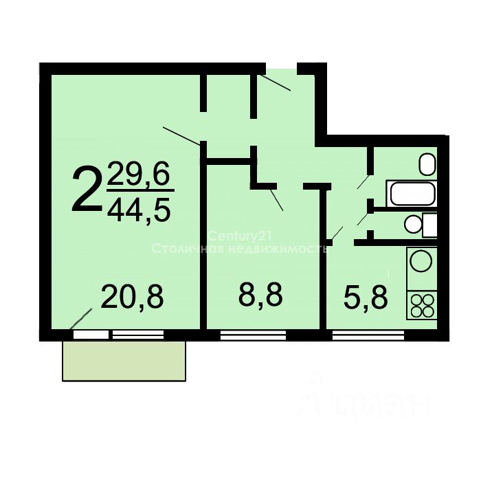 2 изолированные комнаты 20,8 м2+9 м2;