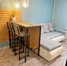 Полностью укомплектован себелью и всей бытовой техникой. Большой угловой диван, стол под баоную стойку разделяет пространство кухни и спальни. Много всестительных шкафов. Встроенный комплект кухонного гарнитура. Установлен кондиционер, есть телевизор.