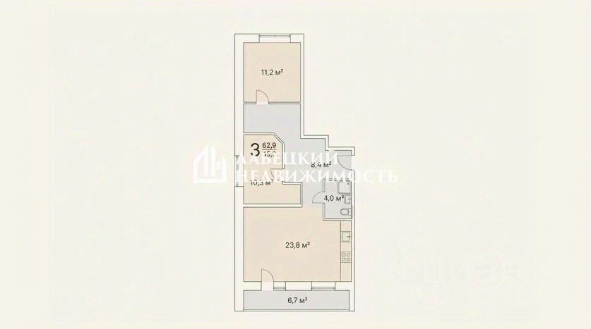 - Две изолированные комнаты: 11,2 м² и 10,3 м²