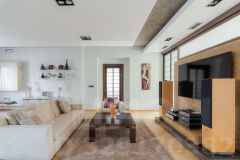 В гостиной - встроенная аудиосистема, на кухне - техника Siemens. Интерьер в мягких молочно-бежевых тонах: лаконично, тепло, без лишних деталей. Много естественного света, натуральные текстуры, спокойная атмосфера. Из окон - зелень, за стенами - тишина и размеренный ритм жизни у самого заказника.