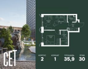 В ЖК Сет продается 1-комнатная квартира площадью 35.90 м², расположенная в корпусе 2, на 30 этаже 59 этажного дома.