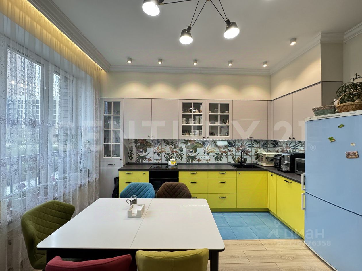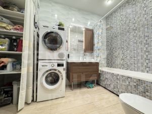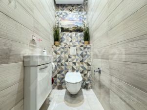 Кухня выполнена в современном стиле с панорамными окнами — здесь много света и воздуха. Встроенная мебель и техника уже есть, пространство полностью готово к использованию. Ванная комната отделана мозаикой, установлена современная сантехника. Санузлов два, они раздельные.