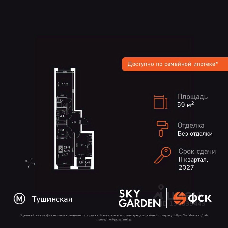 Продаётся 2-к квартира номер 570 общей площадью 59.9 кв.м. на 13-м этаже 27 этажного здания. Без отделки. Цена с учётом скидки.