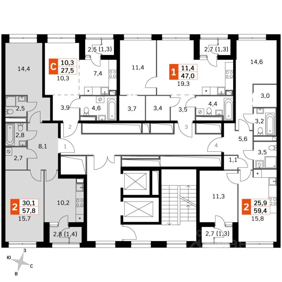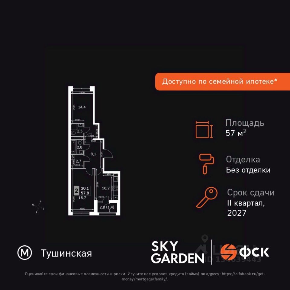 Продаётся 2-к квартира номер 654 общей площадью 57.8 кв.м. на 8-м этаже 30 этажного здания. Без отделки. Цена с учётом скидки.