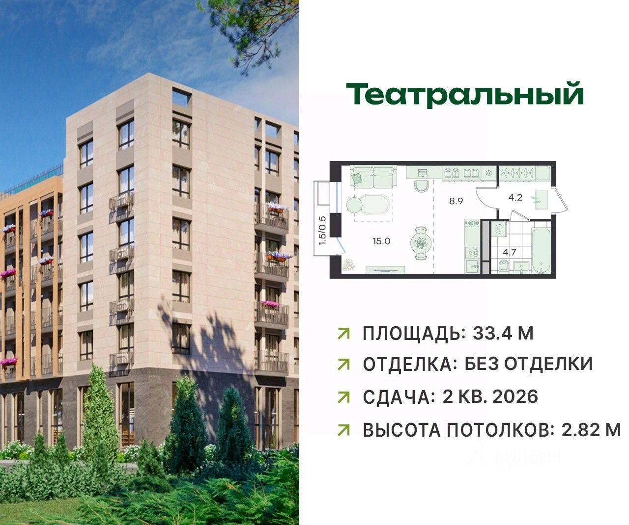В современном квартале бизнес-класса ЖК "Театральный" продаётся квартира-студия, общей площадью 33.4 кв.м, расположенная на 5 этаже (корпус 2, секция 2).