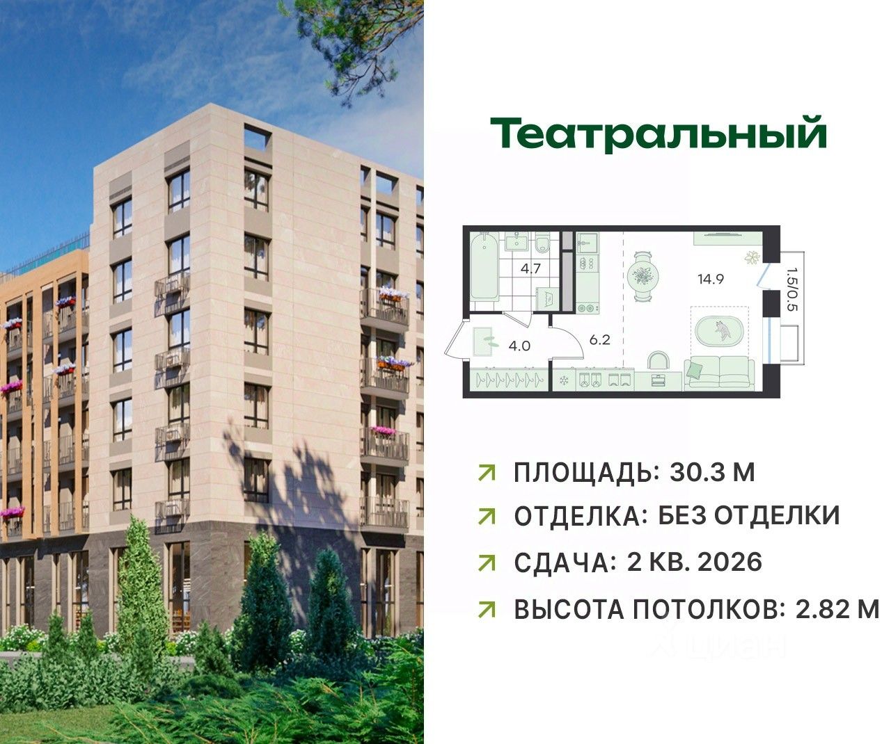В современном квартале бизнес-класса ЖК "Театральный" продаётся квартира-студия, общей площадью 30.3 кв.м, расположенная на 5 этаже (корпус 2, секция 6).