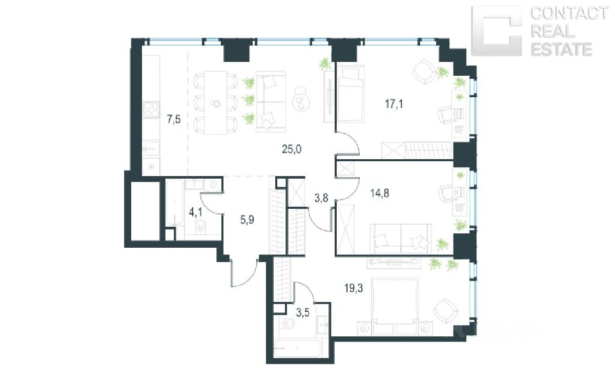 Функциональная планировка предусматривает: кухню-гостиную со столовой зоной, мастер-спальню с гардеробной и санузлом, две изолированные комнаты, которые могут служить спальнями, кабинетом или уютной детской, гостевой санузел.