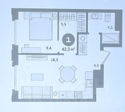 Общая площадь — 42.3 м², высота потолков — 3 м, окна в закрытый двор!